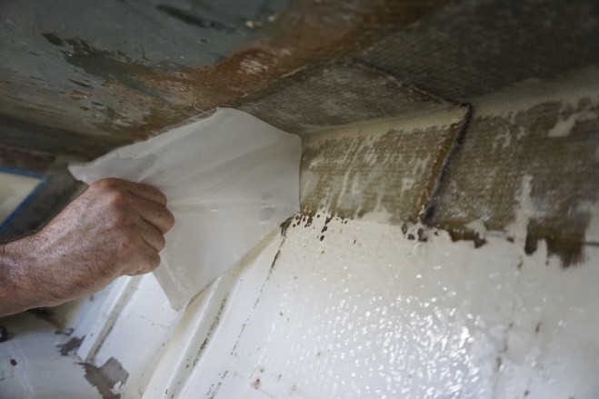 Previous ImageNext Image Fiberglass Removing peel ply on the hull to deck joint Share this: Share on X (Opens in new window) X Share on Facebook (Opens in new window) Facebook Like Loading...
