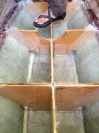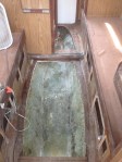After finishing the brew coat (a food grade epoxy coating), we prepared to epoxy the forward sole section and the main cabin sole/tank top into position. We applied epoxy to the tops of the flange from the old cabin sole, and to the new floors and baffles in the water tank.