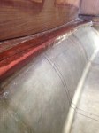 Brian finished the headliner removal this week. First, we unfastened a couple of stanchions, handrail bolts, and trim that were in the way. Next, Brian used a chisel, a multi-max, and some muscle to pull out the remaining sections of the headliner. Some pieces were tabbed to bulkheads with narrow fiberglass tape. These were more difficult to remove, but he got the job done quickly.